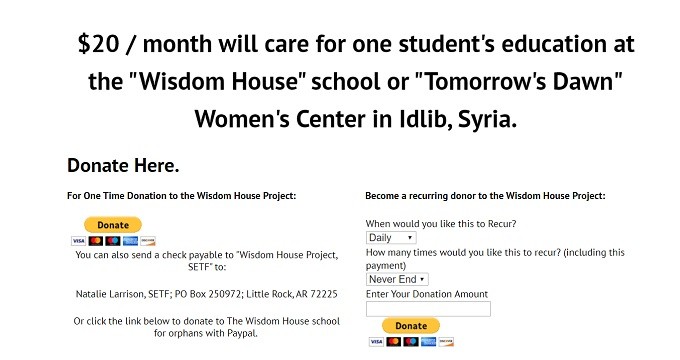 The name of the Arkansas charity-that-is-not-a-charity is The Wisdom House Project, to be or not to be confused with Wisdom House Project, no “the,” which used to exist as a little organization that made scripture-based greeting cards, but which disappeared around the time that the NGO-charity for painting the faces of little girls in Idlib emerged.
