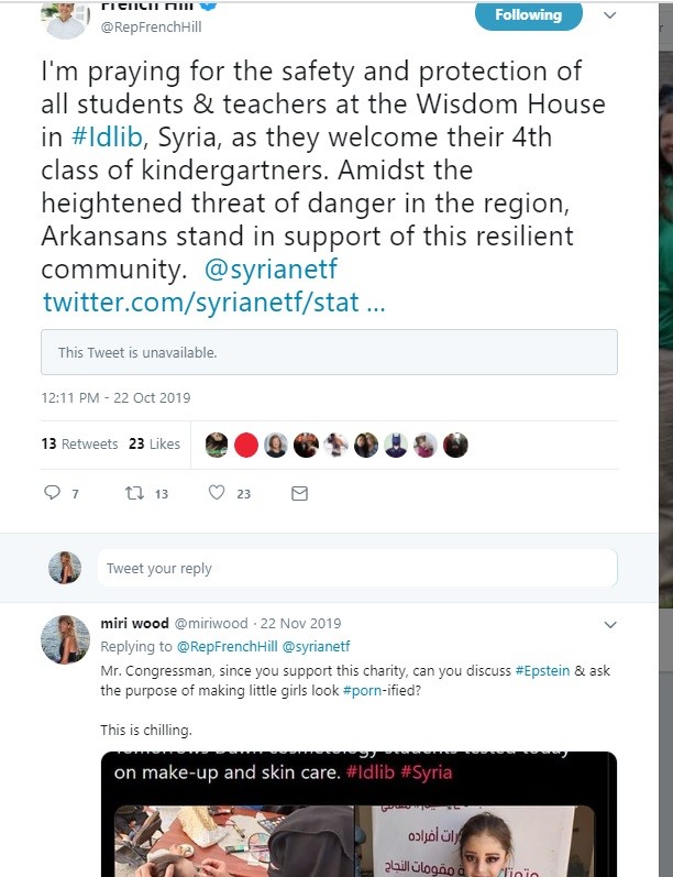 The continuing unfolding of the Epstein child-trafficking horrors did not have an impact on the congressman, who did not respond to the worrisome report brought to his attention, but who subsequently showed his alliance by receiving members of the SETF/The Wisdom House Project, along with Qatar’s “Caesar” hoax dude in the blue hoodie, and one of sixty million survivors of non-stop torture in Syria’s thirty million torture prisons.