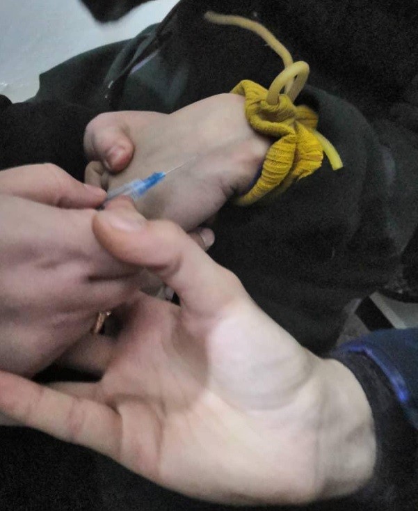 The man who staged this absurdity should get a pay cut: The dorsal vein has not been primed for venipuncture; there is no reason for that torqued man hand to be holding the hand which is holding the barrel of the syringe.