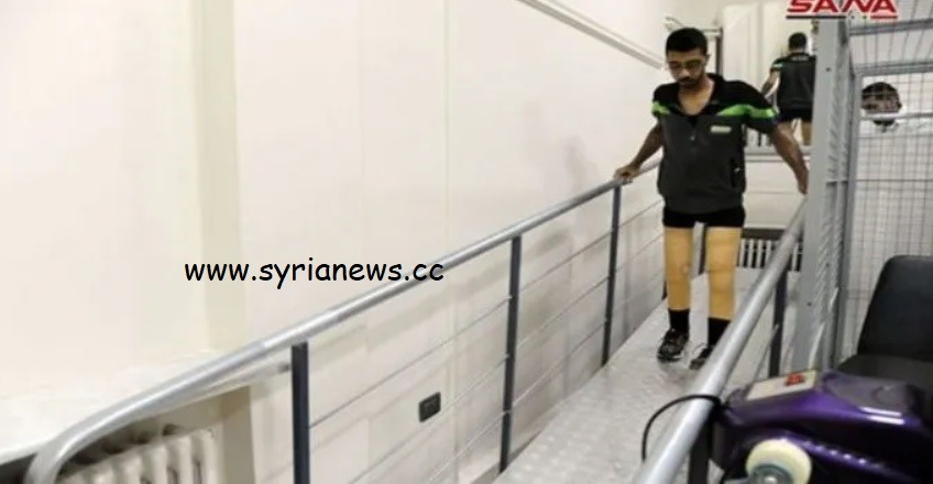 A Syrian boy has his prosthetic arm adjusted by orthotics specialist.