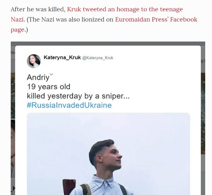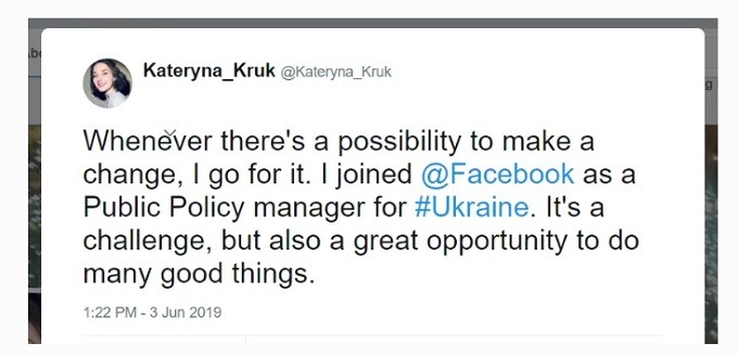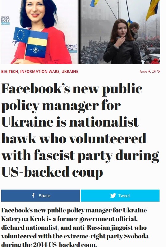 The word, “Nazi” is frequently tossed about in social media threads. Here, again, Facebook has appointed itself as the lone despot that chooses when the word is permitted, and when it is deemed ”hate speech.” Such policing seems more of the “don’t do as I do, do as I say,” dictation: In June 2019, it hired a staunch supporter of the Nazimaidans — Kateryna Kruk — as Facebook’s public policy manager for Ukraine.