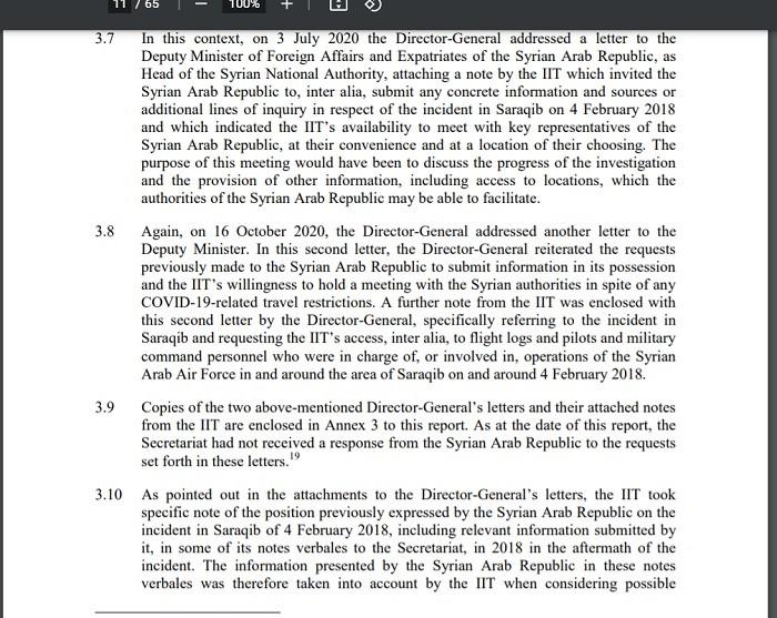 The watchdog’s IIT 12 April criminal report on what the terrorists who occupied Saraqib told them vomits up the same lies in the FFM; the only difference is that the IIT’s use about twice as many words (essential for keeping those tax-free NATO paychecks, relocation subsidies, and wonderful benefits). One of the slight differences is that the FFM did not quite blame the government for lack of access into al Qaeda territory, frequently whined its suggestion that the “impossibility to access the site of the [alleged] incident” was somehow the SAR’s responsibility, even while noting Saraqib was under terrorist occupation.