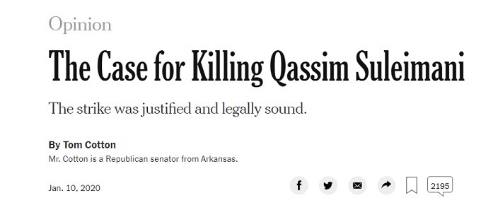 There was barely a burp of disapproval when the NYT gave him their audience to cheer his approval when Trump assassinated ICRG Commander Qasem Soleimani in Iraq (similarly, there were no complaints against Facebook mass obliteration of accounts for condemning the assassination).
