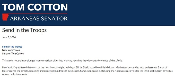 Cotton is ”trending” for his Opinion Piece published by the New York Times: Send in the Troops, pasted from his website funded — of course — by US taxpayers.