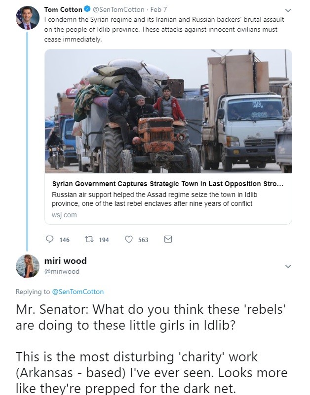 Tom Cotton also ignored this writer’s request to investigate an Arkansas-based “charity” whose 501(c) tax deductions are via the State Department affiliated Syrian Emergency Task Force. The ‘SETF’ coordinated “The Wisdom House” in Idlib has a heinous Epstein-like stench about it, with men hiding under niqab painting little girls to look like they are being marketed to child porn perverts on the darknet.