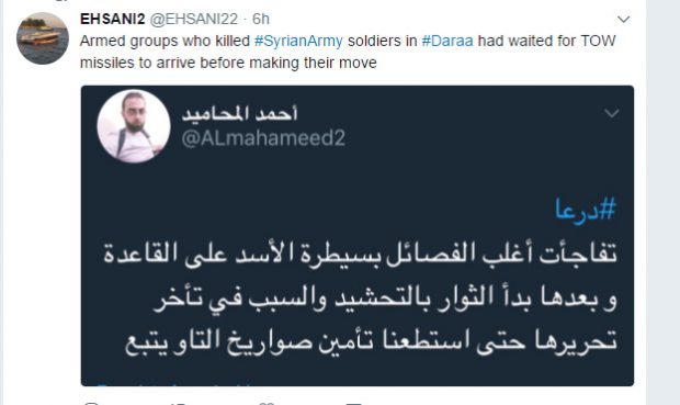 The US has been providing terrorists in Syria with tube launched, optically tracked wire-guided missiles since April 2014. On 17 May, the terrorist gang of Mahal Thawraaweer thanked US for 20 trucks — some loaded with TOWS — to be used to murder Syrian soldiers in Deir Ezzor — mere days after the SAA foiled an ISIS attack on the airport. How much more obvious does the US/ISIS collaboration need to be?