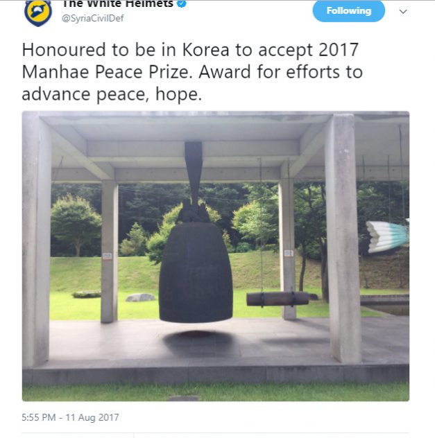 Update 30 August: The Seoul-terrorists in Syria has solidified since Dutch mercenary gang IB Consultancy brought adoptive Frenchman Hakim to attend that 19 May meeting. On 11 August, Seoul gave an Orwellian peace award to the death squads in Syria: