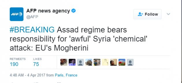 On 4 April, scant hours after al Nusra declared Syria used chemical weapons in Khan Sheikhoun, Federica Mogherini dictated that the “regime” was ‘responsible for the awful chemical attack.’ It was of no concern for any NATO medium to mention that there was no time for an investigation into whether there was a ‘chemical attack,’ nor the lack of diplomacy in decreeing culpability for that which had not been shown to have happened.
