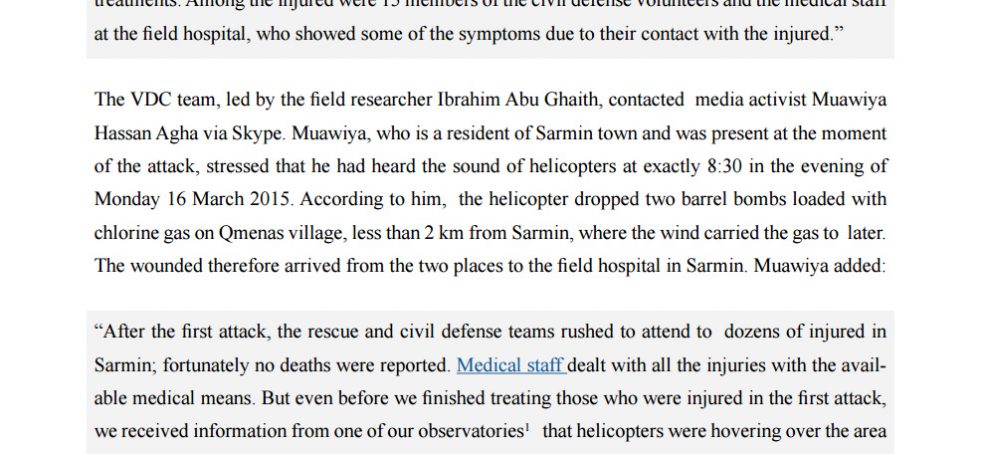 Hassan is not only an armed spokesman for the White Helmets, he is a fake key eyewitness to the various ‘chemical weapons’ hoaxes in Idlib, according to the “Violations Documentation Center in Syria” involving “chemical attacks in Idlib.”