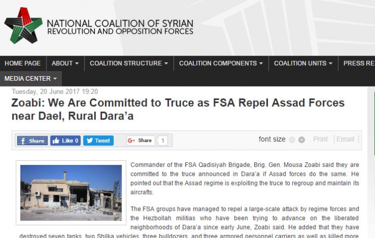 On this same date, the White Helmets affiliated NCSROF reported that a “Brigadier General,” “Mousa Zoabi” — unknown to virtually everyone — announced that the FSA was committed to a truce, now that the takfiri “have managed to repel a large scale attack…”