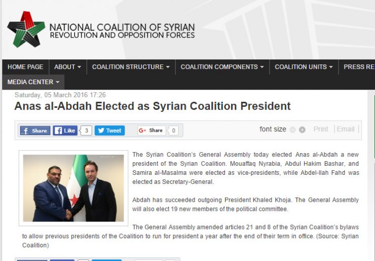 At the time of this meeting, Abdah was the president of the NATO and Gulfies supported NCSROF, previously named the “Syrian National Coalition.” Abdah followed the stoner Turkmen Khoja as hoax leader (Khoja followed al Jarba, a convicted drug dealer and suspected pimp). The NCSROF as SNC was founded in Doha, Qatar, which is not Syria.
